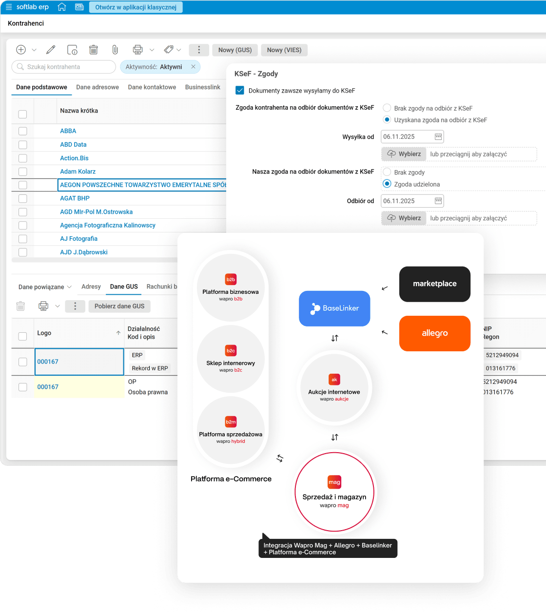 Integrate data with KSeF, REGON/VAT, transport and Asseco ERP modules